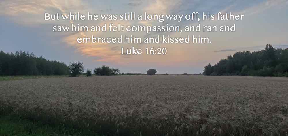 And he said, “There was a man who had two sons. And the younger of them said to his father, ‘Father, give me the share of property that is coming to me.’ And he divided his property between them. Not many days later, the younger son gathered all he had and took a journey into a far country, and there he squandered his property in reckless living. And when he had spent everything, a severe famine arose in that country, and he began to be in need. So he went and hired himself out to one of the citizens of that country, who sent him into his fields to feed pigs. And he was longing to be fed with the pods that the pigs ate, and no one gave him anything. “But when he came to himself, he said, ‘How many of my father’s hired servants have more than enough bread, but I perish here with hunger! I will arise and go to my father, and I will say to him, “Father, I have sinned against heaven and before you. I am no longer worthy to be called your son. Treat me as one of your hired servants.” ’ And he arose and came to his father. But while he was still a long way off, his father saw him and felt compassion, and ran and embraced him and kissed him. And the son said to him, ‘Father, I have sinned against heaven and before you. I am no longer worthy to be called your son.’ But the father said to his servants, ‘Bring quickly the best robe, and put it on him, and put a ring on his hand, and shoes on his feet. And bring the fattened calf and kill it, and let us eat and celebrate. For this my son was dead, and is alive again; he was lost, and is found.’ And they began to celebrate. “Now his older son was in the field, and as he came and drew near to the house, he heard music and dancing. And he called one of the servants and asked what these things meant. And he said to him, ‘Your brother has come, and your father has killed the fattened calf, because he has received him back safe and sound.’ But he was angry and refused to go in. His father came out and entreated him, but he answered his father, ‘Look, these many years I have served you, and I never disobeyed your command, yet you never gave me a young goat, that I might celebrate with my friends. But when this son of yours came, who has devoured your property with prostitutes, you killed the fattened calf for him!’ And he said to him, ‘Son, you are always with me, and all that is mine is yours. It was fitting to celebrate and be glad, for this your brother was dead, and is alive; he was lost, and is found.’ ”