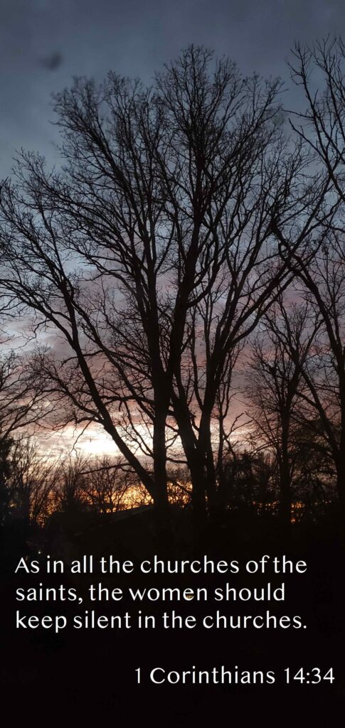 For God is not a God of confusion but of peace. As in all the churches of the saints, the women should keep silent in the churches. For they are not permitted to speak, but should be in submission, as the Law also says. If there is anything they desire to learn, let them ask their husbands at home. For it is shameful for a woman to speak in church.