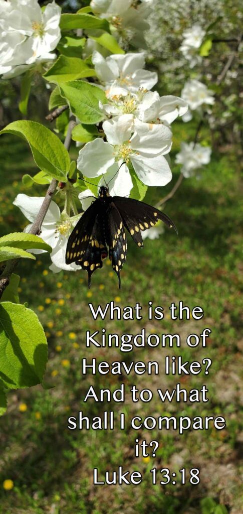 He said therefore, “What is the kingdom of God like? And to what shall I compare it? It is like a grain of mustard seed that a man took and sowed in his garden, and it grew and became a tree, and the birds of the air made nests in its branches.” And again he said, “To what shall I compare the kingdom of God?  It is like leaven that a woman took and hid in three measures of flour, until it was all leavened.”
