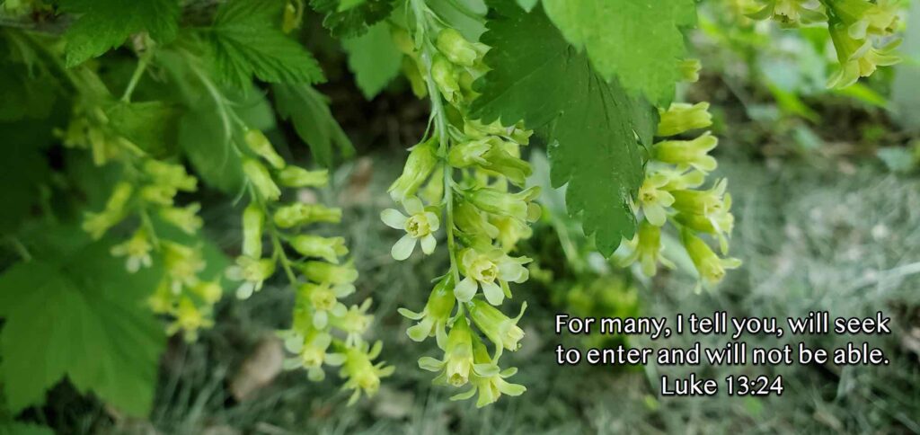 He went on his way through towns and villages, teaching and journeying toward Jerusalem.  And someone said to him, “Lord, will those who are saved be few?” And he said to them,  “Strive to enter through the narrow door. For many, I tell you, will seek to enter and will not be able.  When once the master of the house has risen and shut the door, and you begin to stand outside and to knock at the door, saying, ‘Lord, open to us,’ then he will answer you, ‘I do not know where you come from.’  Then you will begin to say, ‘We ate and drank in your presence, and you taught in our streets.’  But he will say, ‘I tell you, I do not know where you come from. Depart from me, all you workers of evil!’  In that place there will be weeping and gnashing of teeth, when you see Abraham and Isaac and Jacob and all the prophets in the kingdom of God but you yourselves cast out.  And people will come from east and west, and from north and south, and recline at table in the kingdom of God.  And behold, some are last who will be first, and some are first who will be last.”